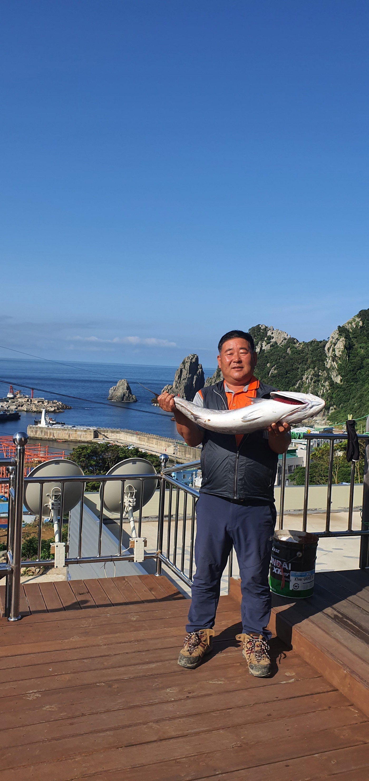 가거도 전경이 보이는 둥구펜션의 테라스 앞에서 찍은 사진이네요! 사진 속 사장님이 들고 있는 생선은 방어입니다! 직접 잡으신걸까요? 그건 직접 가서 물어봐야 할 듯 합니다!